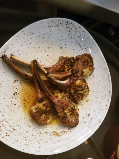 Herb crusted rack of lamb with bean and kale ragu & cherry cabernet sauce