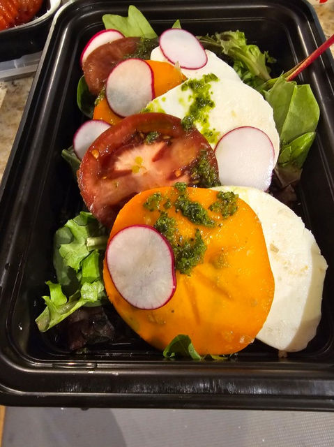 Baby spinach salad with apple balsamic vinegar, blueberries, honey comb, garden tomatoes and pepita